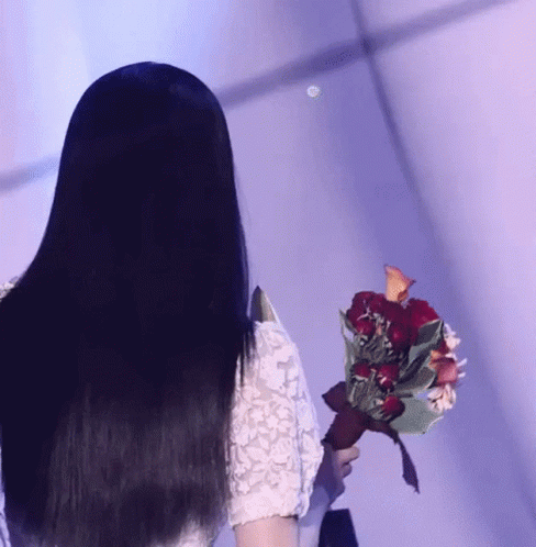 a woman is holding a bouquet of red roses in her hands .