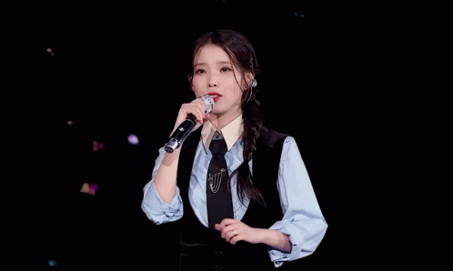 a woman is singing into a microphone while wearing a blue shirt and tie .
