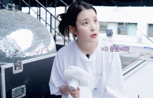 a woman in a white shirt is holding a fan with a question mark above her