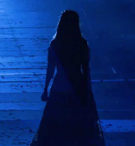 a silhouette of a woman with a crown on her head in a dark room