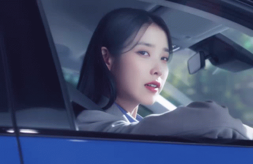 a woman is sitting in a blue car with her eyes closed