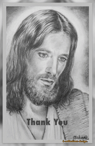 a black and white drawing of jesus with the words thank you below it