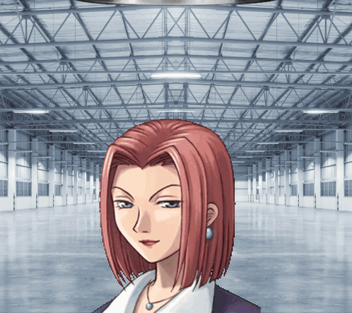 a woman with red hair is standing in a large building