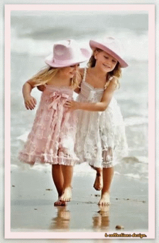 two little girls wearing hats and dresses walking on a beach