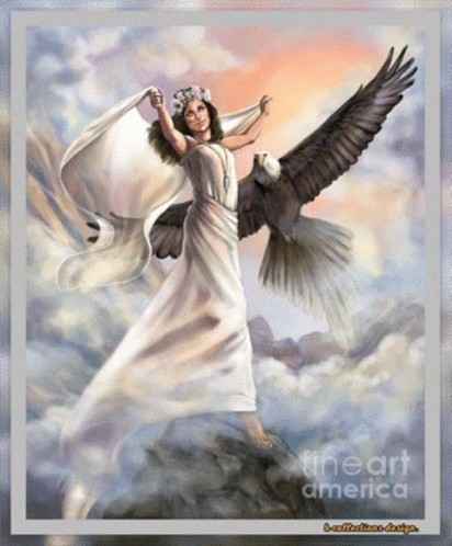 a painting of a woman holding a bald eagle with fineart america written on the bottom