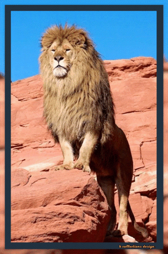 a picture of a lion standing on a rock with the words reflections design on the bottom