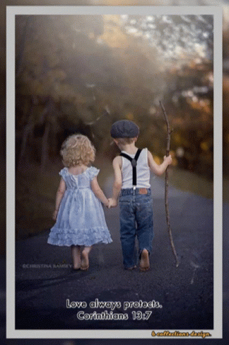 a boy and a girl are walking down a road holding hands with the words love always protects
