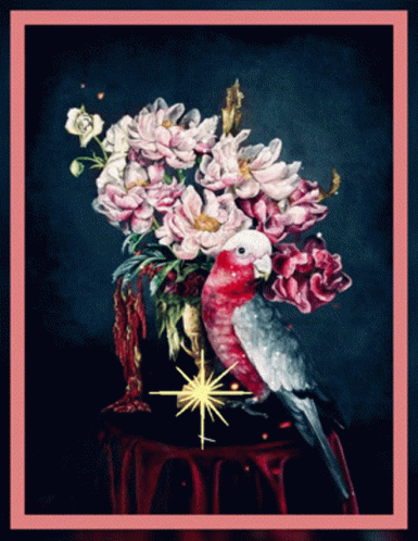 a painting of a bird sitting on a table next to flowers