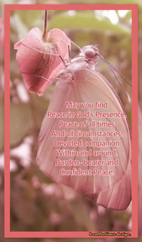 a pink and white butterfly with a quote that says " may you find peace in god 's presence "