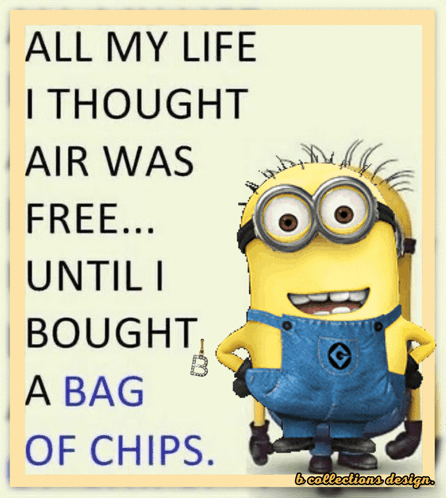 a picture of a minion with the words all my life i thought air was free until i bought a bag of chips on it