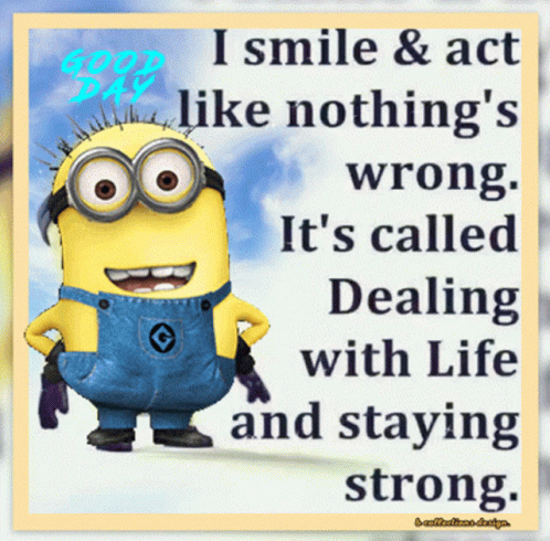 a picture of a minion with the words " i smile and act like nothing 's wrong "