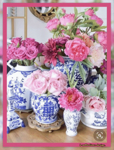 blue and white vases filled with pink flowers with a pink frame