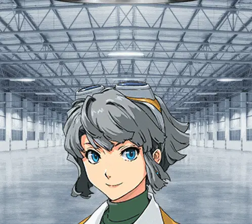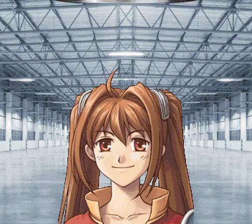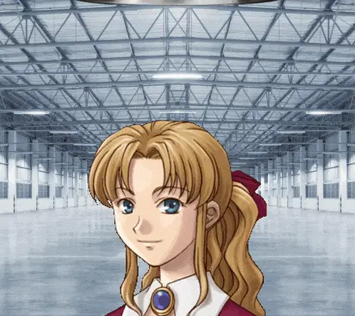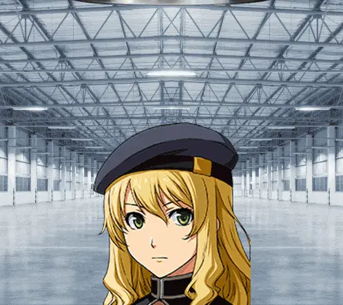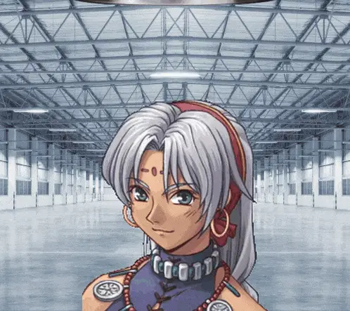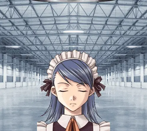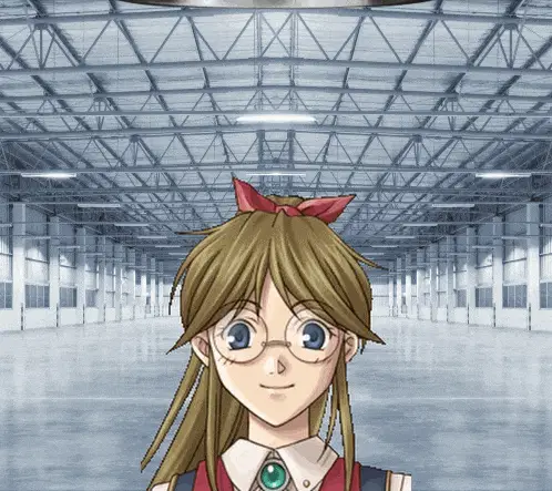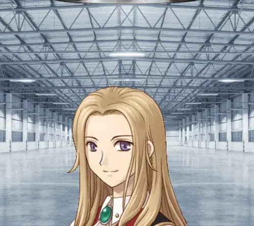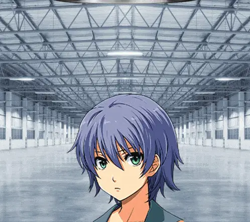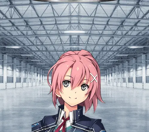 a girl with pink hair and blue eyes is standing in an empty building