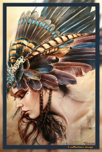 a painting of a woman wearing a feathered headdress is titled vivzing