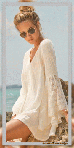 a woman wearing sunglasses and a white dress is sitting on a rock on the beach