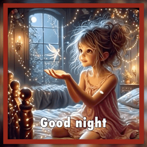a painting of a little girl sitting on a bed with the words " good night " written on the bottom