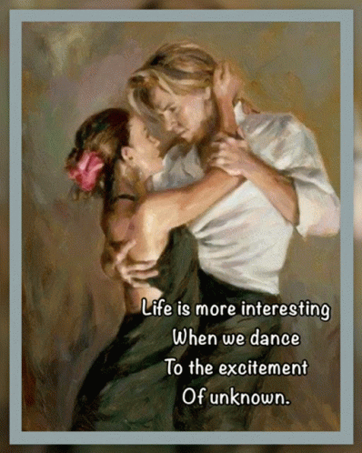 a painting of a man and woman dancing with the words life is more interesting when we dance to the excitement of unknown below them