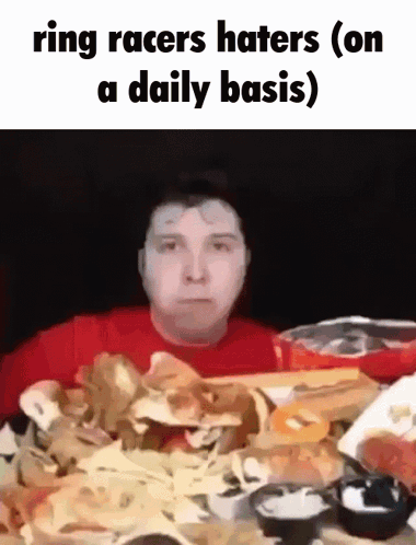 a man is sitting at a table with a bunch of food and says ring racers haters