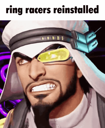 a man with a beard wearing sunglasses and a white hat with the words ring racers reinstalled