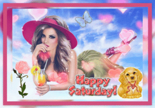a happy saturday greeting card with a woman drinking a cocktail