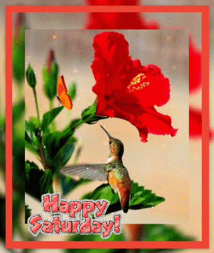 a happy saturday card with a hummingbird on a flower