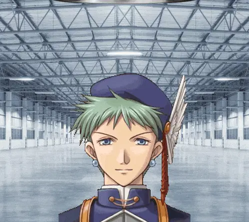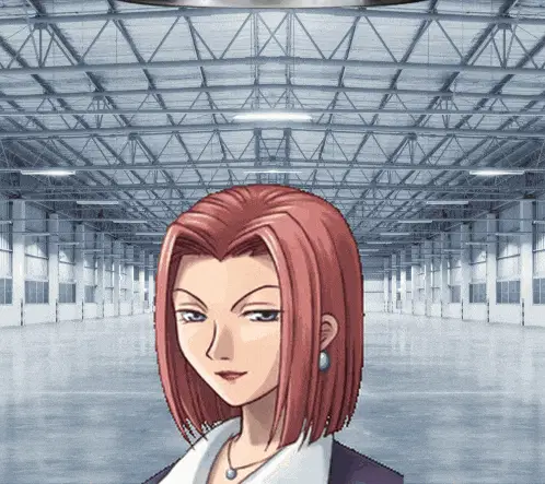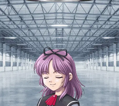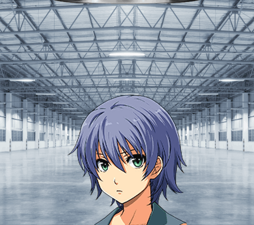 a girl with blue hair and green eyes is standing in an empty building
