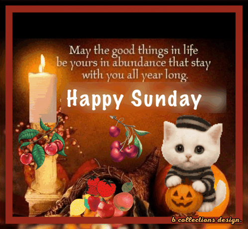 a happy sunday card with a cat holding a pumpkin and a candle