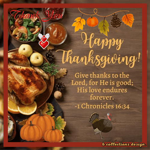 a thanksgiving greeting card with a turkey and a quote from 1 chronicles 16:34