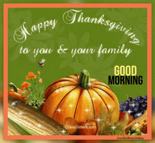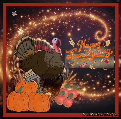 a happy thanksgiving card with a turkey pumpkins apples and leaves
