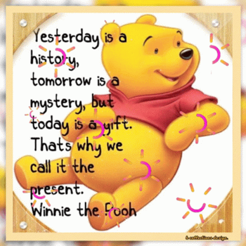 a picture of winnie the pooh with a quote that says yesterday is history tomorrow is a mystery but today is a gift