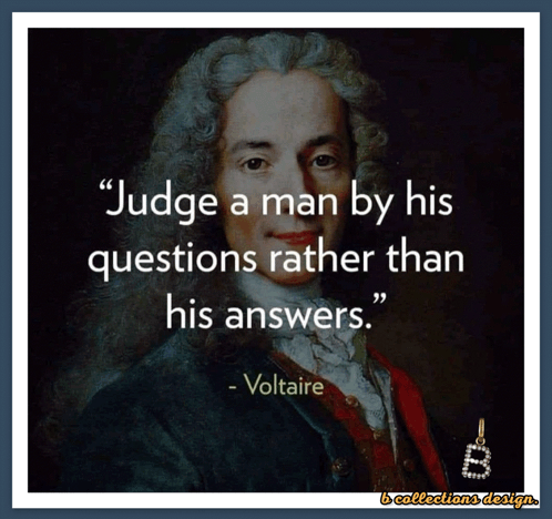 a picture of voltaire with a quote that says judge a man by his questions rather than his answers