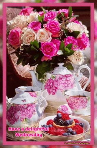 a bouquet of pink roses sits on a table next to a teapot and cups