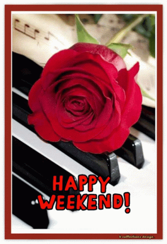 a red rose sits on top of a piano keyboard with the words happy weekend written below it