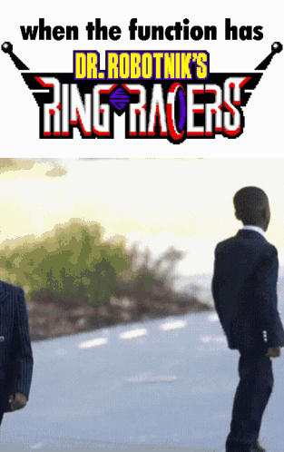 a poster for dr robotnik 's ring racers shows two men in suits standing next to each other